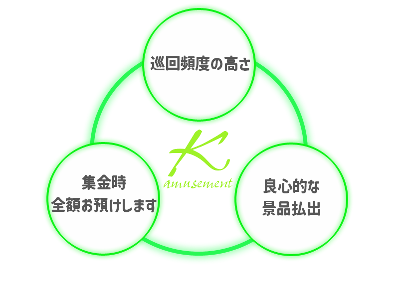 - 巡回・集金・・・景品補充と清掃メンテナンスを定期実施、集金を行い売上金を全額お預け致します。